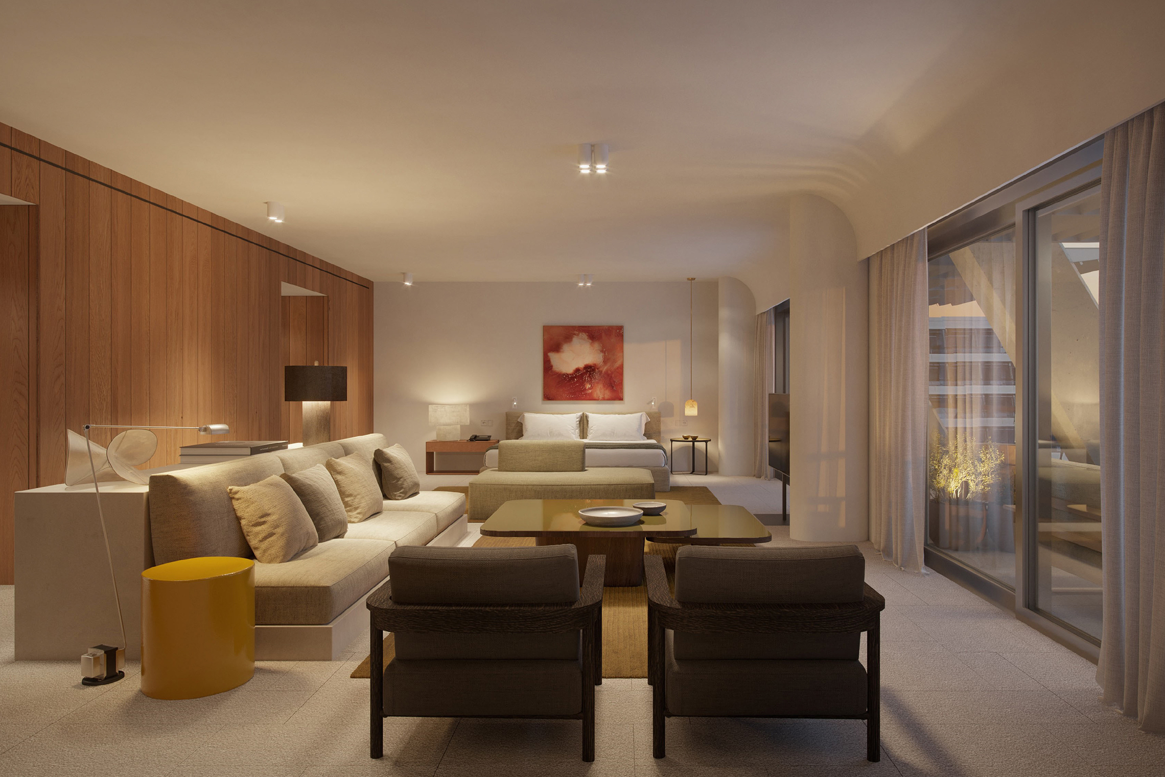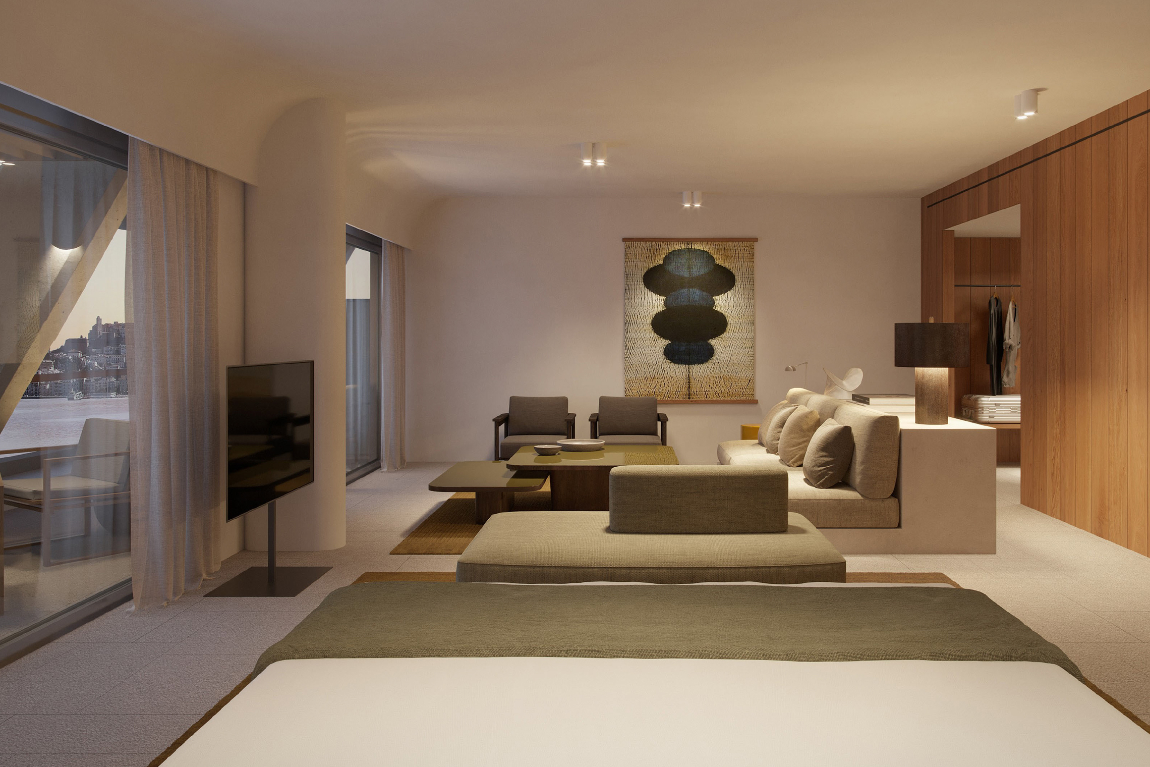 Im 5. Stock. Verfügt über eine Terrasse mit Badewanne mit Massagedüsen, von der aus wir die atemberaubende Aussicht auf das Meer und die ummauerte Stadt Ibiza bestaunen können. Der Zugang zum Open Spa – Wasserkreislauf ist inbegriffen.