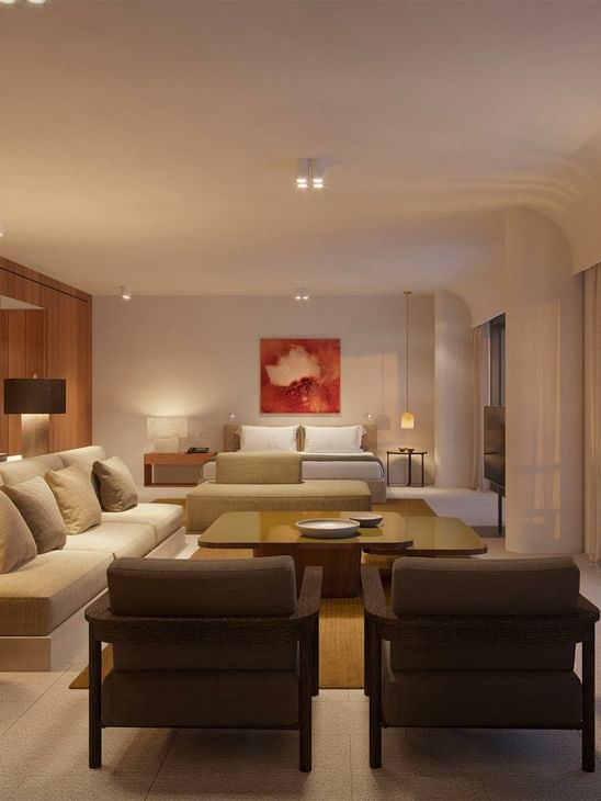 Chaque suite offre un mélange unique d'intimité et de raffinement, où le design méditerranéen contemporain et les œuvres d'art soigneusement sélectionnées créent des espaces empreints de personnalité.